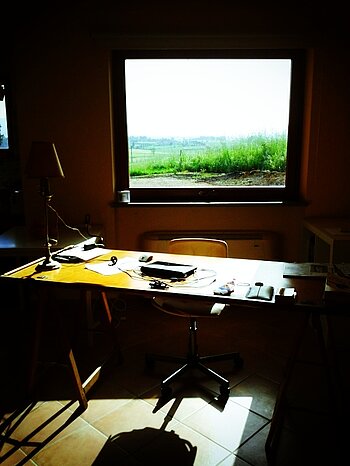 Schreibtisch vorne, hinten Gemälde