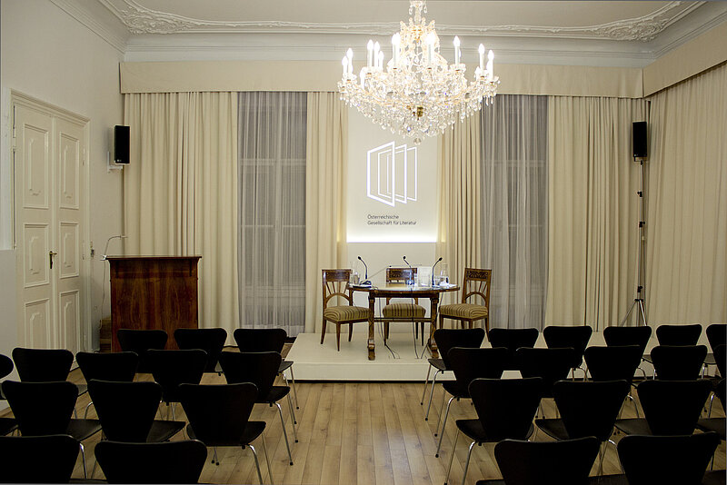 AV-Ausstattung: professionelle Tonanlage und Mikrofone, Präsentations-Laptop (Apple), div. Steckverbindungen für eigenen Laptops, Beamer und Leinwand, DVD- und VHS-Player sowie Kassettendeck